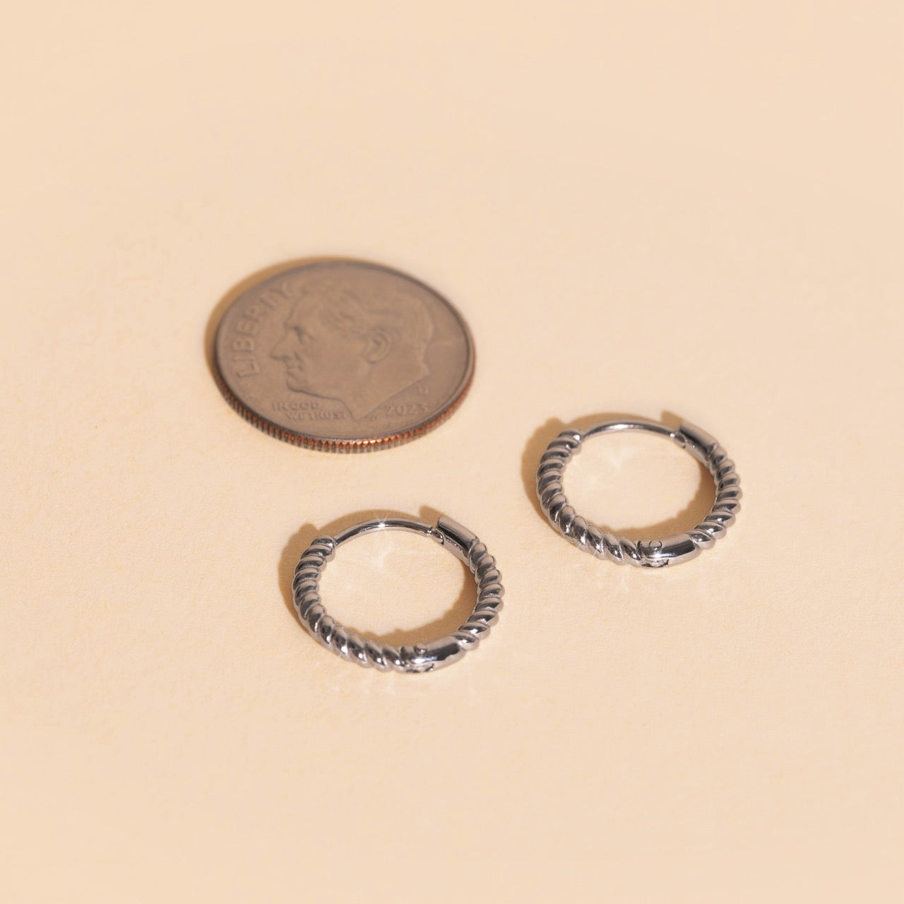 Model two is wearing our Titanium Thinny Rectangle Huggie (platinum), Mini Rounded Huggie (silver) and Rope Rounded Huggie (silver).